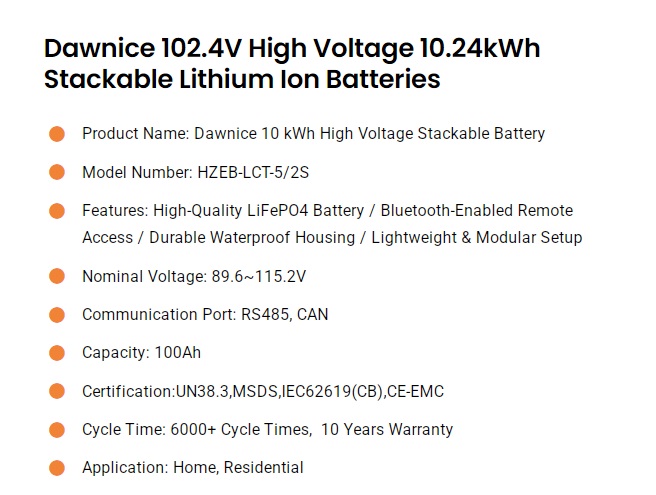 | Product Name | Dawnice 10.24kWh 102.4v/100Ah High Voltage Stackable Lithium Ion Batteries |