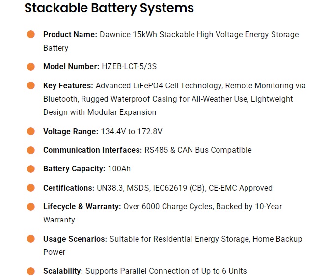 | Product Name | Dawnice 15.36kWh 150v High Voltage Stackable Battery Systems |
