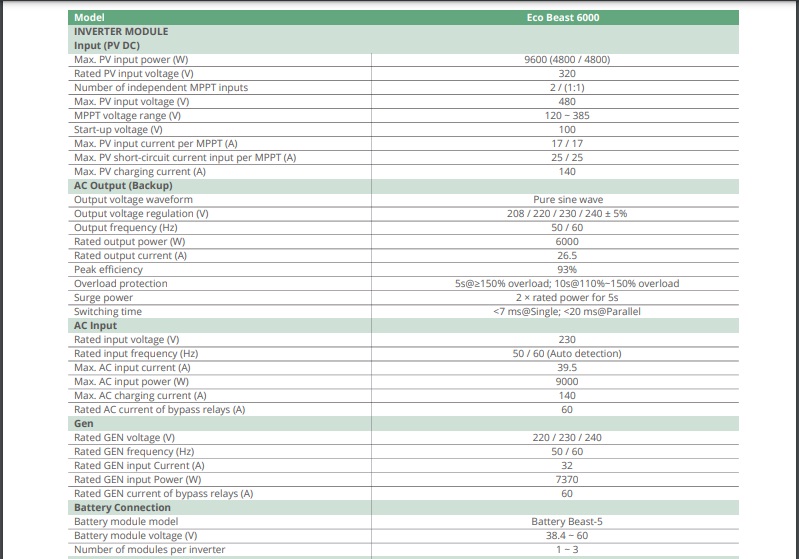 | Product Name | Eco Beast 6000 6kW Solar Inverter AIO Ess Solution |