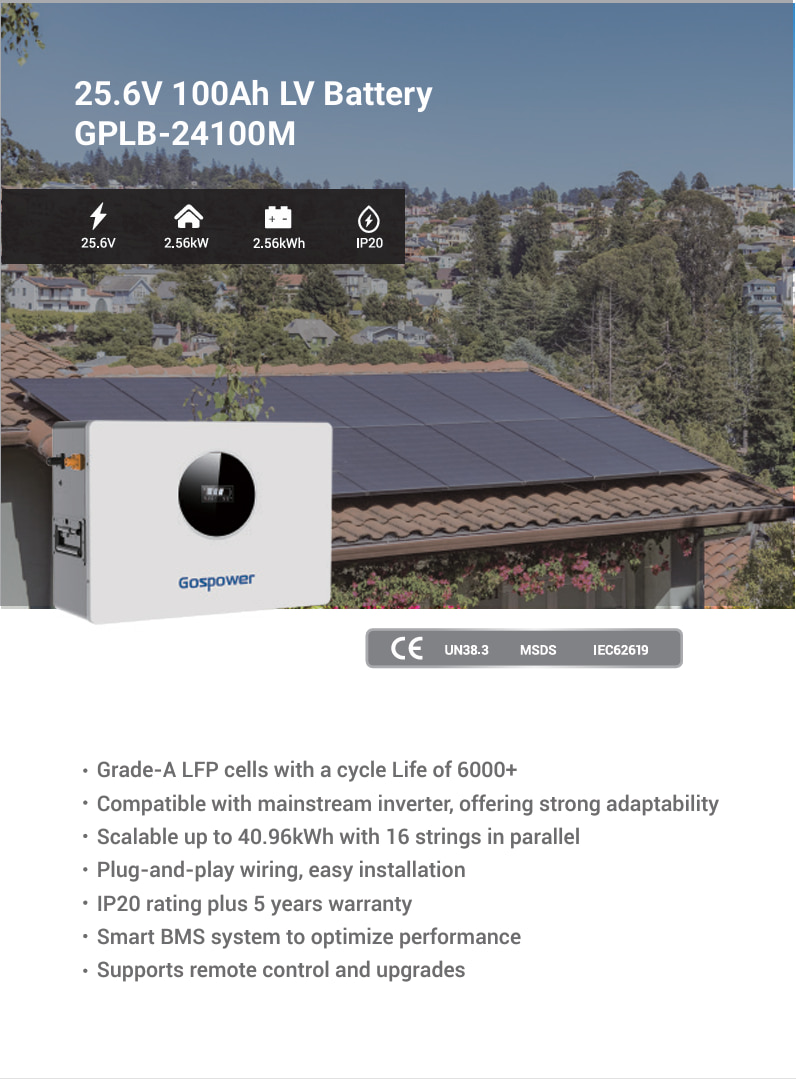 | Product Name | Gospower 2.56kWh 25.6v 100ah GPLB-24100M lithium battery 10years warranty |