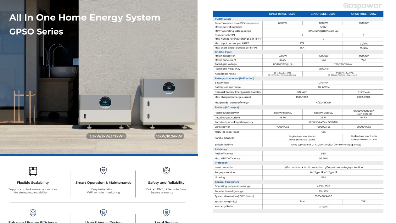 Gospower 5kW All In One Home Energy System. The Gospower GPSO series all-in one energy storage system combines an inverter, MPPT solar charger, and battery. It supports a maximum of 12 units for paralleling. The battery capacity ranges from 5.12kWh to 20.48kWh with up to 4 units paralleling.