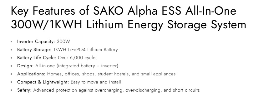 | Product Name | SAKO Alpha ESS All In One 300W/1KWH Lithium Energy Storage System |