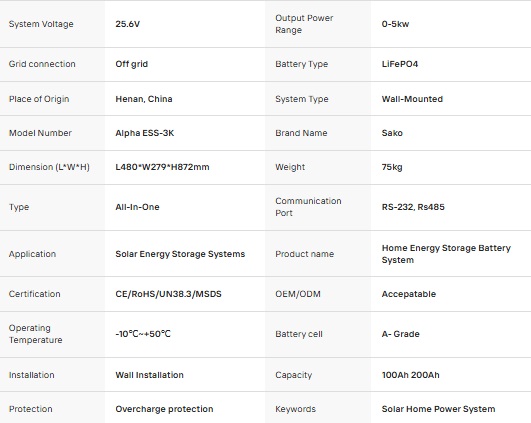 | Product Name | SAKO Alpha ESS All-In-One 3KW/2.56KWH Lithium Energy Storage System |