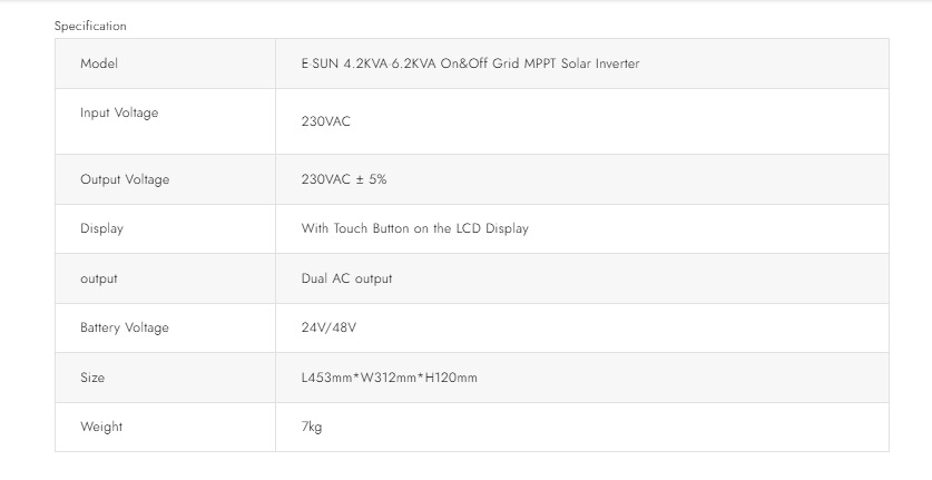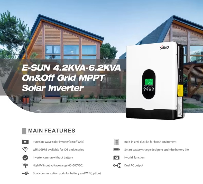 | Product Name | SAKO E-SUN 4.2kVa 24V ON-Grid OFF Grid MPPT Hybrid Solar Inverter |
