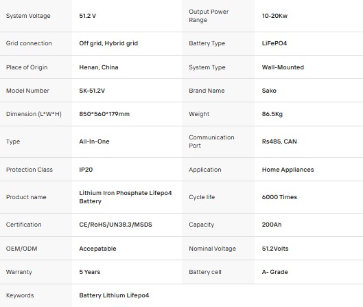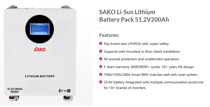 | Product Name | SAKO Li-Sun 10kWh - 51.2v/200Ah Wall Stand Lithium Battery |